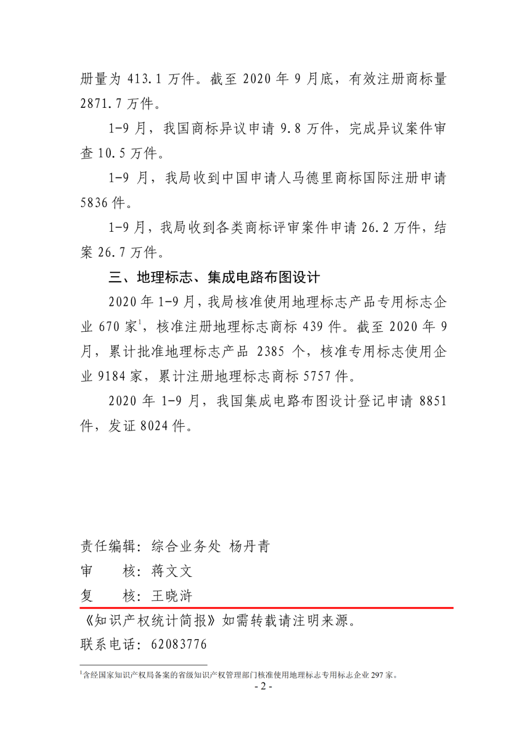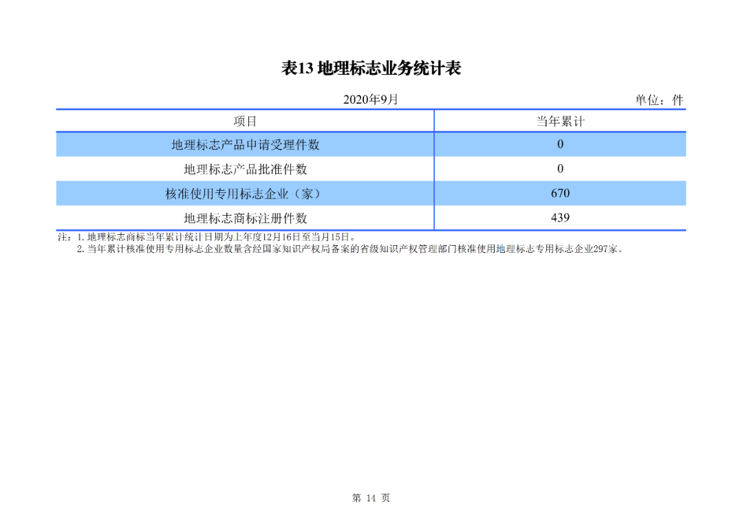 2020年1-9月,我局核准使用地理标志产品专用标志企业670家,核准注册地理标志商标439件。截至2020年9月,累计批准地理标志产品2385个,核准专用标志使用企业9184家,累计注册地理标志商标5757件。