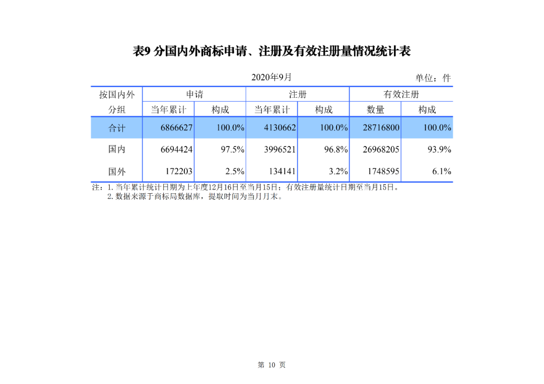 2020年1-9月,我国商标申请量为686.7万件,商标注册量为413.1万件。截至2020年9月底,有效注册商标量2871.7万件。